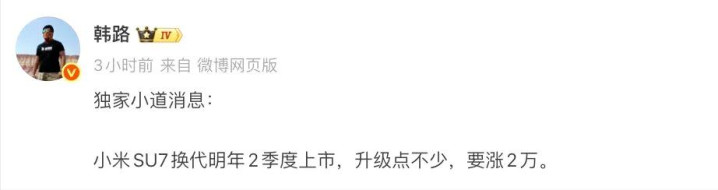 根据圈内大V的爆料,明年二季度小米SU7就要迎来换代了,虽然价格可能会涨个两万块,但据说升级的项目多到数不过来。